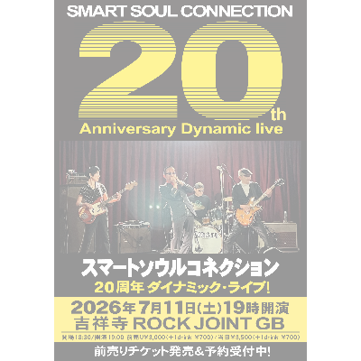 ファンキーでスウィンギーなバンドサウンドに乗せて、豪快にブロウするブルースハープ(ハーモニカ)と、“曲のタイトルだけを歌う”という独自のスタイルを駆使して、世界中にあふれるモノ、仕事、感情、現象などが醸し出す“説明のつかないカッコ良さ”を、誰もが口ずさめる「簡単な音楽」で表現する他に類を見ないバンド、スマートソウルコネクションの結成20周年ライブが、2026年7月11日(土)に開催決定!!